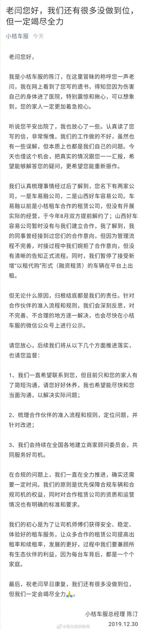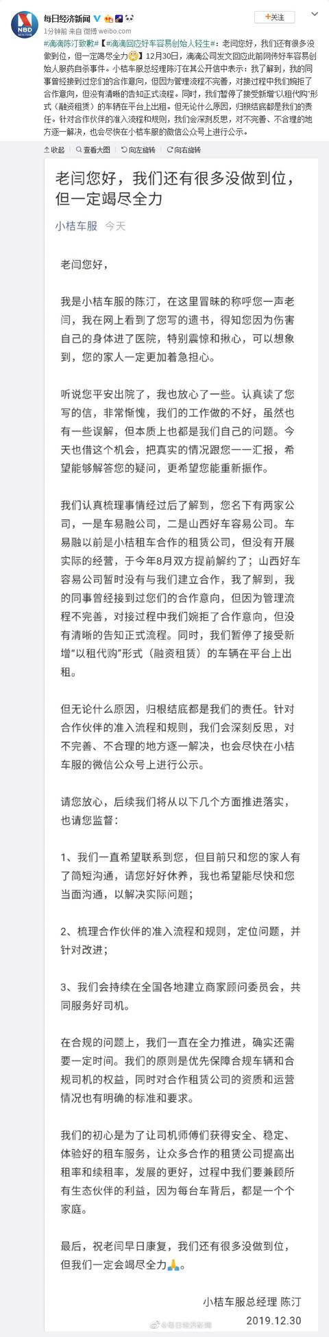 12月30日,滴滴公司发文回应此前网传好车容易创始人服药自杀事件。小桔车服总经理陈汀在其公开信中表示:我了解到,我的同事曾经接到过您们的合作意向,但因为管理流程不完善,对接过程中我们婉拒了合作意向,但没有清晰的告知正式流程。同时,我们暂停了接受新增“以租代购”形式(融资租赁)的车辆在平台上出租。但无论什么原因,归根结底都是我们的责任。针对合作伙伴的准入流程和规则,我们会深刻反思,对不完善、不合理的地方逐一解决,也会尽快在小桔车服的微信公众号上进行公示。