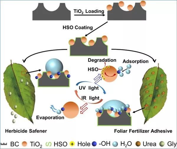 课题组以生物炭和纳米二氧化钛为原料,制备了一种浸润性受到光调控的作物表面防护剂。该防护剂在作物叶片表面,通过红外和紫外调节其亲水疏水状态,既可以保证疏水状态下减少除草剂等在非靶向作物上的黏附,又可以保证亲水状态下叶面肥的高效使用。该技术成本低,操作简单,环境友好,可为作物的表面防护提供有效合理的解决方案与技术支撑,具有广阔的应用前景。