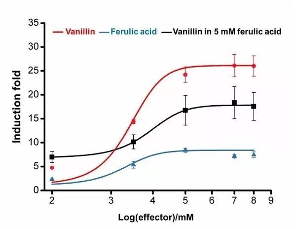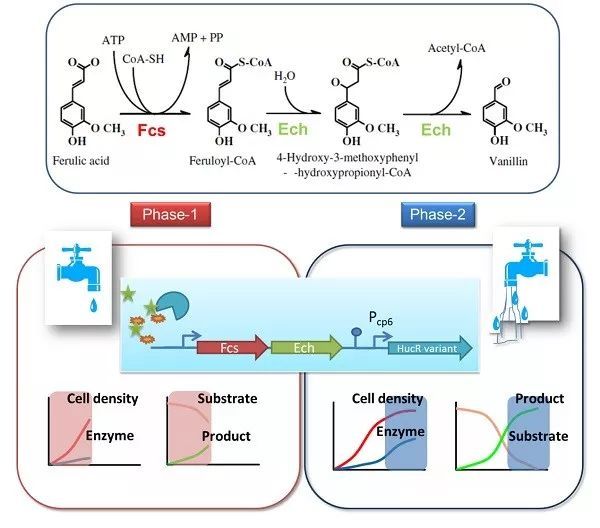 香草醛是可应用于食品、医药等领域的重要化合物。在生物合成时,香草醛对宿主菌有毒性,对细胞膜和胞内蛋白具有破坏作用。其抑制毒性在宿主菌生长前期表现尤为显著。以大肠杆菌为宿主细胞合成香草醛的途径之一是以阿魏酸为底物,经阿魏酰辅酶A合成酶(Fcs, trans-feruloyl-CoA synthetase)和烯酰基辅酶A水解酶/醛缩酶(Ech, enoyl-CoA hydratase/aldolase)两步催化完成。中国科学院微生物研究所唐双焱团队通过巧妙筛选调控蛋白识别效应物的特异性,设计构建可不同程度响应底物阿魏酸和产物香草醛累积浓度的动态调控元件,由此调控香草醛合成相关基因(fcs, ech)表达,研究显示受此调控元件控制的代谢通路在生物合成香草醛上比传统的组成型启动子、诱导型启动子及基于群感效应构建的启动子具有显著优势。在此基础上,对启动强度上做精细调控,以期缓解生长前期的代谢负担,增加生长后期代谢活性,最终有效提高香草醛产量。此项工作进一步拓展了蛋白质定向进化手段在代谢工程研究中的应用,为天然产物生物合成途径的设计构建提供了新的思路和调控元件。