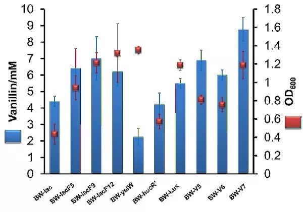 图3 该研究调控元件应用于香草醛生物合成与其他元件在香草醛产量的比较