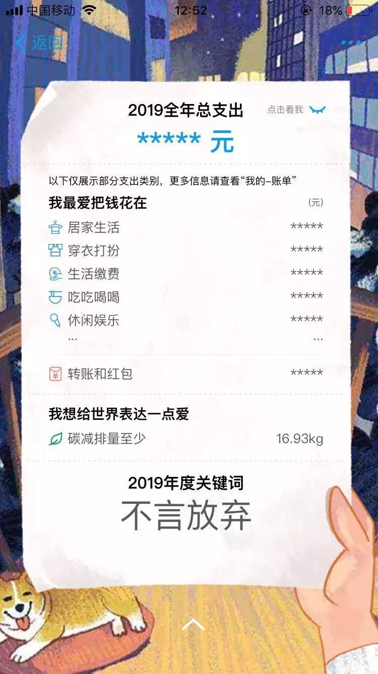 这一次支付宝将消费支出分为居家生活、穿衣打扮、吃吃喝喝、学习与健身、休闲娱乐、交通出行、通讯快递等种类,用户还能查看自己一年中使用手机扫码支付公交出行的次数,以及有多少次用支付宝缴费、一年走了多少步数减少了多少碳排放等。而大家看完账单却惊人地相似,网友纷纷转发了这个表情: