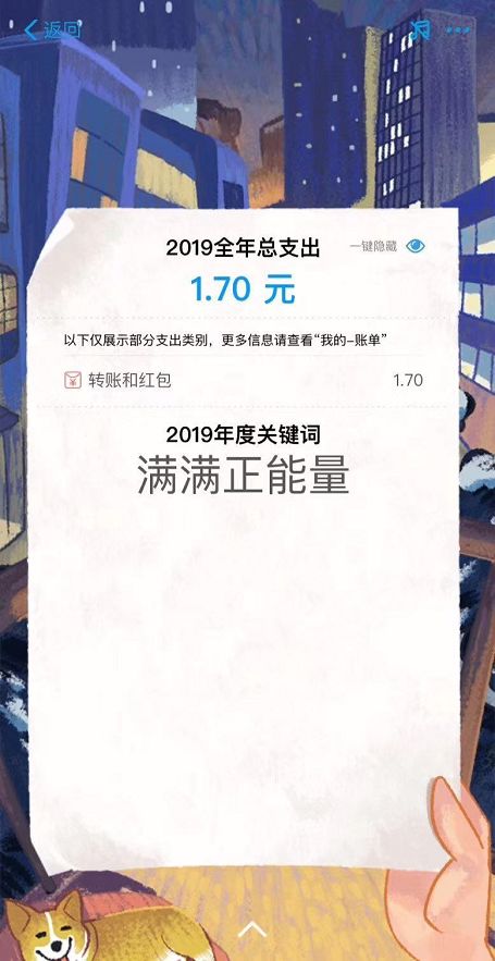 这位网友表示自己支付宝全年消费总计1.7元,2019年度关键词还是满满正能量,为何还单身?看到这个账单的其他网友不淡定了:你别以为我不知道,你的钱都是从微信花出去的吧?