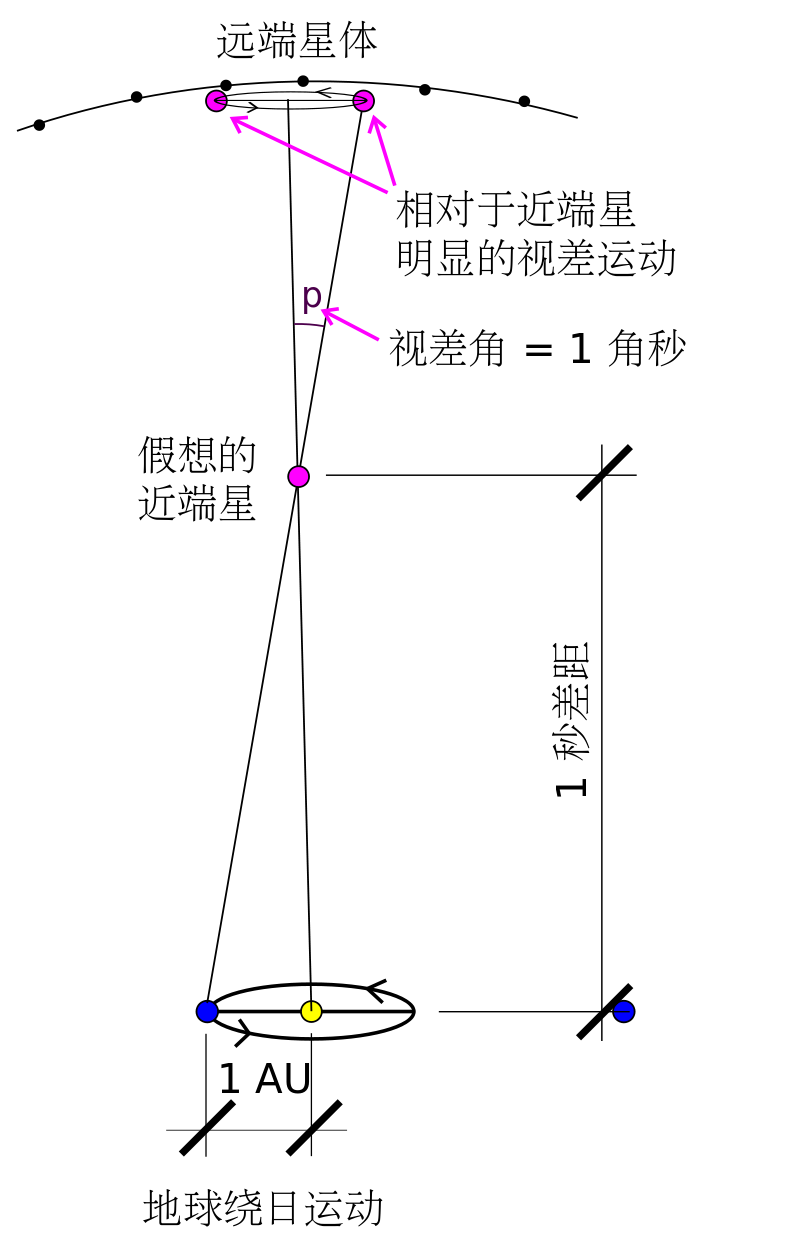 图解:恒星视差的单位是秒差距,这是天体到太阳距离视差角度的倒数。(1天文单位和1秒差距是不同的尺度,1秒差距 = 206,265天文单位。)