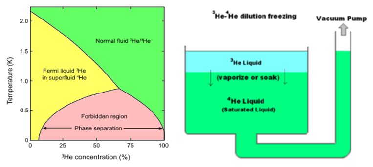 继续降低温度,我们基本已经来到了1K附近的温区,单纯的通过压缩4He再降低液氦蒸汽压的方法已经很难再使温度继续下降。科学家利用相同的方法对氦的同位素3He进行液浴减压可以到0.3K。实际上。3He和4He的混合液在0.87K以上温度时可以以任意比例互溶,在0.87K以下时发生相分离,即分成含3He较多的浓相和含3He较少的稀相两部分,两者间构成一界面,浓相浮于稀相之上。当3He原子从浓相通过界面进入稀相时,由于4He的超流特性,3He在超流态4He中不受任何阻力,好似在真空中一般,这个过程类似于普通液体通过液面蒸发成气体,要吸热致冷,这就是稀释制冷的原理。稀释制冷机就是利用这一原理,再通过压缩机将稀相的3He-4He蒸馏分离出4He,再将3He通过循环系统重新回到浓相,利用稀释制冷技术,我们可以到达1.5mK的温度。现如今,稀释制冷机已经成为凝聚态实验物理学家研究的利器。