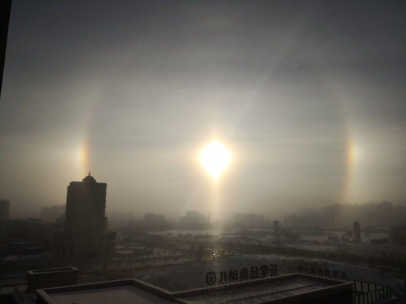 1月12日上午,内蒙古自治区呼伦贝尔市海拉尔区,日出后天空上方出现“幻日”奇观,太阳左边和右边好似彩虹的光带,这种现象持续了三个多小时。