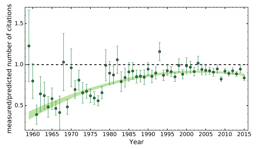 在过去的65年里,女性第一作者的天文学论文少被引用10%相对于男性第一作者的同类论文。这是瑞士苏黎世联邦理工学院的Neven Caplar、Sandro Tacchella和Simon Birrer的一项研究得出的结论。他们研究了1950-2015年间发表的20多万篇论文。虽然从1950年到1990年,男性的引用量和女性的引用量之间的差距有所下降,但是自从1990年以来,这个差距一直维持在6%左右。在第一篇论文发表后的七年里,女性第一作者的论文数量也比男性少19%。三人同时还发现,女性第一作者的论文数量从20世纪60年代的5%增加到今天的25%。这三位作者在arXiv的预印本中还发现,在过去65年里,《科学》和《自然》等著名期刊的女性作者论文数量增长最慢。