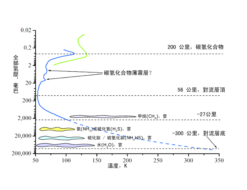 图解:天王星大气层的对流层和平流层低层的温度曲线图,数层的云和霾也表示在图中。