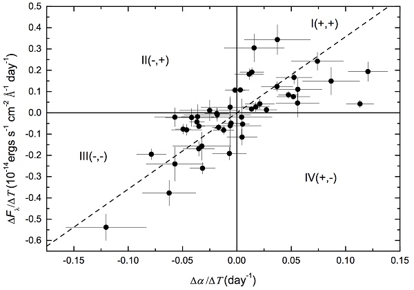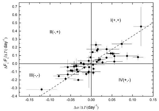 他们研究发现S5 0716+714的准同时性光谱和测光光变都有BWB趋势。在亮度变化率—颜色变化率图上,BWB趋势明显(图1、图2)。颜色与亮度、颜色变化率与亮度变化率之间强相关,并进一步发现光谱指数变化超前于流量密度变化,色指数变化超前于星等变化。BWB的出现可能依赖于观测频率范围相对于同步辐射峰值频率的位置,例如,观测频率范围在同步峰值频率的左侧。