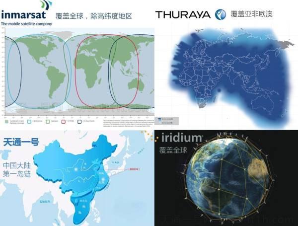 天通一号、海事卫星电话、铱星电话、欧星电话的网络覆盖范围对比