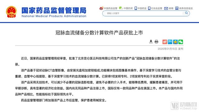 2019年1月16日,公众号“北京药监”发文表示,该产品为首个进入国家药品监督管理局创新医疗器械审批绿色通道并获批的人工智能医疗影像辅助决策产品,是第一个取得三类医疗器械注册证的人工智能医疗产品。