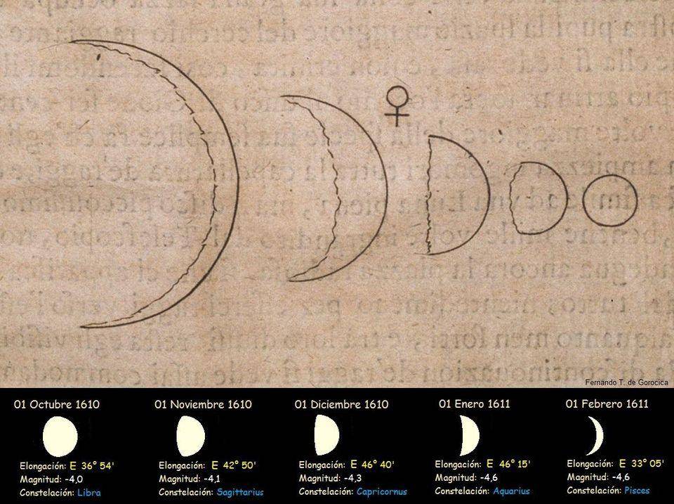 图片来源:伽利略最初(1610年)绘制的金星相位草图,维基百科用户费尔南多·德戈罗西卡,已获得C.C.A.-S.A.-3.0的授权。