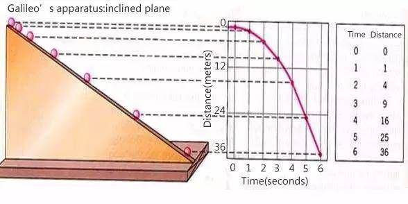 他花了40年才完成这个实验,但是伽利略在不同的角度设置了斜坡然后让球滚下来,同时在不同的间隔处放置紧绷的吉他弦,从而听到球滚过弦时发出的均匀的声音。他发现,这些间隔之间遵循着这样的一个规律:1,3,5,7…这意味着对按规律的时间间隔排列的总距离而言,它随之遵循着1,4,9,16…或者1², 2², 3², 4²…这样的规律。伽利略还发现声音的规律与斜坡倾斜的角度无关,因此他得出结论:如果你将物体置于90度(垂直)的状态,你不仅可以观察到相同的规律,你还会明白加速度完全是由重力造成的!
