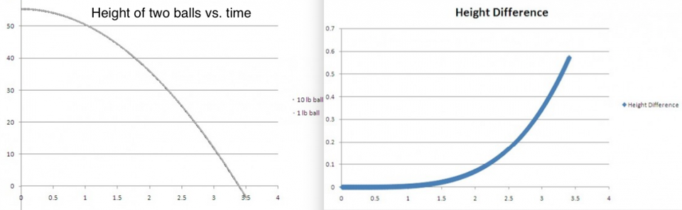 图片来源:西格尔的研究表明,(左图)在一定时间内(x轴,秒),1磅铁球和10磅铁球下落的距离(y轴,米);在右图中,高度差被显示为时间的函数(x轴,秒)。