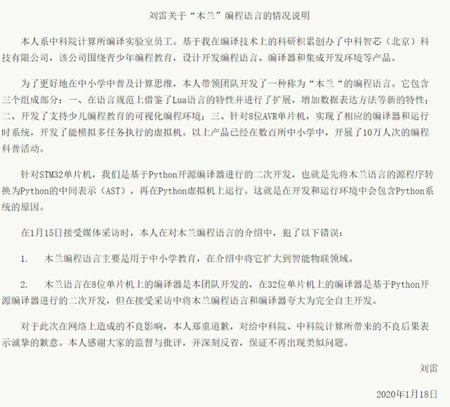 消息一出,引起了开发者社区的讨论。有网友质疑该编程语言“木兰”是“换皮”Python。针对这一质疑,1月18日,中科院计算所编译实验室员工、“木兰”语言研发团队负责人刘雷在科学网上发表回应,称木兰语言在8位单片机上的编译器是本团队开发的,在32位单片机上的编译器是基于Python开源编译器进行的二次开发,承认其在接受媒体采访中存在夸大成分,并对“在网络上造成的不良影响”表示“郑重道歉”。