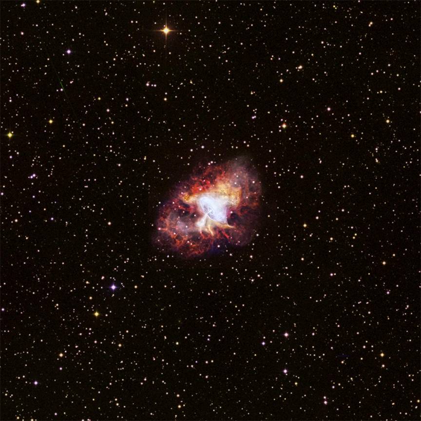 公元1054年,中国天文学家首次记录了一颗明亮的超新星的存在——正是如今蟹状星云的前身。今天的它是一片由气体和尘埃组成的星云,中心有一颗规则旋转的中子星——蟹状星云脉冲星,距我们约6500光年。基于对超新星遗迹及旋转脉冲星及其行为的兴趣,科学家们对它进行了广泛研究。如今研究人员已经证实,蟹状星云也是地球上观测到的能量最高的光源。他们解释说,这一观测到的现象很可能是由于逆康普顿散射,或是电子在脉冲星附近以接近光速的速度与光子相互作用并将能量传递给地球而产生的光子。