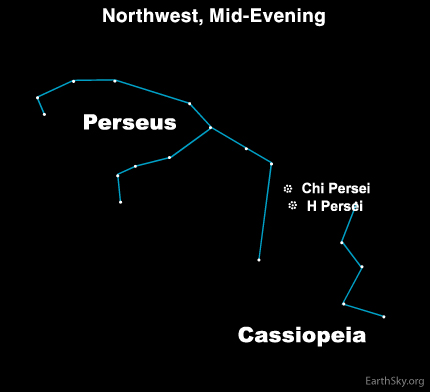 今夜, 你可以在英仙座找到美丽的双星团。假定你的夜空一片漆黑(没有任何光污染),你将可以观赏到一幅美景。要在每年这个时候欣赏到这场美景,请在夜幕降临时候面看向北方到西北方位。双星团是由两个开放的星团组成的疏散星团,被称为“英仙座H”和“英仙座Chi”(也被称为NGC884和NGC869)。