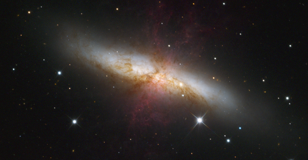 雪茄星系(M82)位于博德星系(M81)正南37‘处。把望远镜对准它,你可能会认为你看到了星系爆炸。其实你看到的是典型的恒星爆发星系。M82的表面亮度比大多数星系都大。为了解释它的意义,我们将M82和M81在目镜中进行比较。虽然M82的亮度比M81低了一度半,但它看起来和M81差不多亮。
