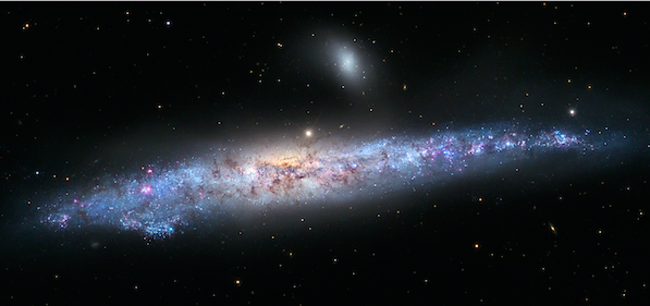鲸鱼星系(NGC 4631)经历了一个小星系(NGC 4627)的近距离穿越,这在很久以前就搅动了一切。它的中心区域是恒星形成的漩涡。通过12英寸或更大的望远镜可以看到巨大的恒星团沿着螺旋臂排列。如果你有幸通过一个孔径大于16英寸的望远镜观察到NGC4631,找找在明亮区域由尘埃和冷气体组成的暗区。