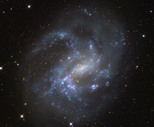 在这张图中NGC 4395看起来令人印象深刻。但是,因为它的测量值为13.2’x 11’,所以它的表面亮度较低。所以你需要用巨大的业余望远镜来仔细观察它的细节。