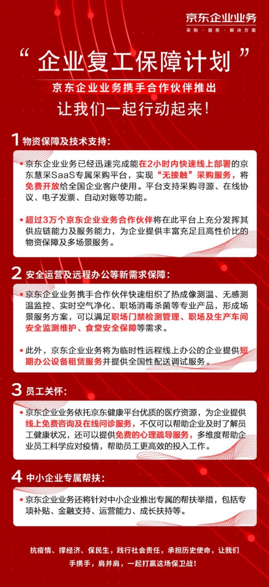 如何安全复工并恢复有序生产运营?面对这一大考,京东发起“企业复工保障计划”,提供一揽子支持。京东免费开放慧采SaaS专属采购平台,推出复工复产安全场景解决方案,京东数科通过科技能力为企业用户提供优惠利率、延期还款、重组展期等服务。从生产物资快速寻源、在线协同等数字化技术支持到中小微企业专项帮扶,京东打响了一场“复工保卫战”。