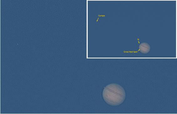 白天的天空过于明亮,比任何-4等*的星体都还要亮。所以,是的,大气层瑞利散射的是造成这一切的原因。(*注释:虽然金星和木星的星等在大多数时候已经足够接近日间目视可见的等级,但因为它们的色调和天空太过相似,所以在日间的天空中并不突出。你需要借助望远镜的帮助,当然也需要知道它们位于天空的哪个方位。)比如,木星通过望远镜看起来如下图: