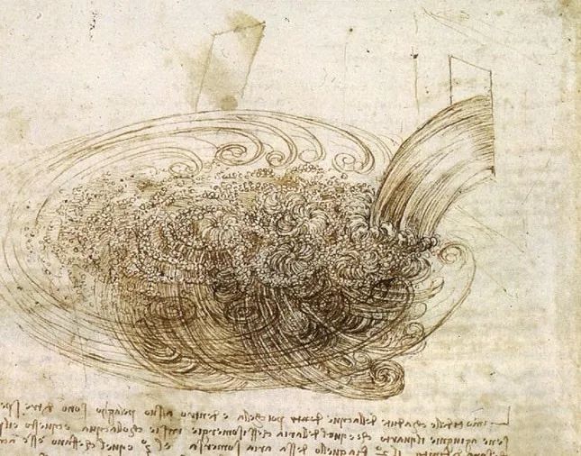 列奥纳多·达·芬奇是最早用视觉化的方式来探讨这一科学问题的先行者,他在1507年就把自己观察到的带漩涡的流体命名为la turbolenza,并用一幅手绘图对其加以描述。“观察一下水面的运动,和头发有着某种类似,头发包含有两种运动,一种是由于它的重量引起的,另一种是由于卷发的方向引起的;因此,水也有涡旋状的运动,一部分是跟着主流,另一部分是随机和反向运动。”