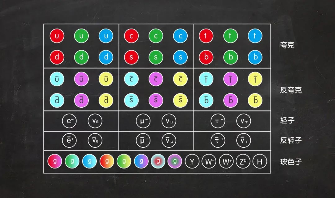 在宇宙中,所有的可见物质都是由夸克和轻子组成的。夸克有六种:上、下、奇、粲、底、顶。同样地,轻子也有六种:电子、μ子、τ子和三种中微子。这些基本粒子都有其相应的反物质粒子,它们具有相同的性质,但却拥有相反的电荷。