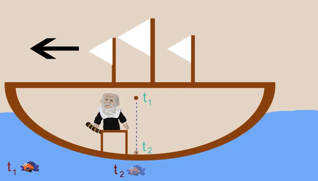 你可以在船舱里做各种实验:你可以跳起来,然后发现自己会落回原地;你去看鱼缸的鱼,发现鱼依然均匀地分布在鱼缸的各个部分,并不会挤向船尾的方向;你可以跟朋友正常地玩篮球,而不用担心篮球会往后窜。