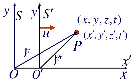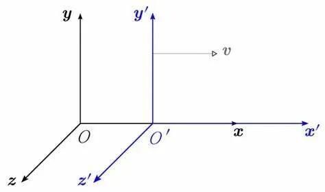 假设我们在地面系S建立一个坐标系(x,y,z,t),有一辆火车以速度v(沿x轴正方向)匀速运动,我们在火车系S’里也建一个坐标系(x’,y’,z’,t’)。为了简化问题,我们让这两个坐标系一开始是重合的。