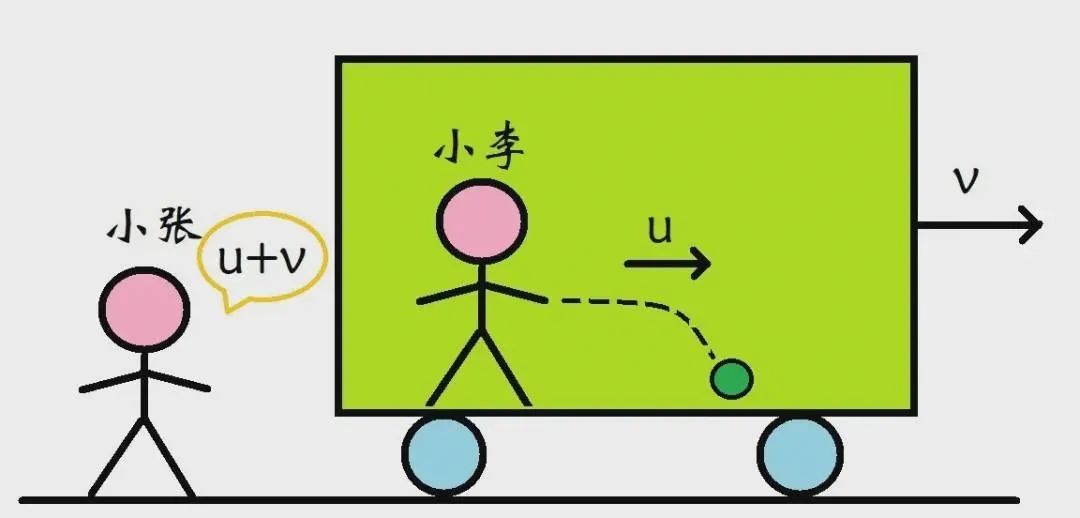 它直接颠覆了我们熟知的速度合成法则。我在地面观测火车上物体的运动速度,那肯定是要把火车的速度和物体的运动速度叠加起来考虑的,怎么可能我在火车上观察这个物体是这个速度,在地面上观察还是这个速度呢?