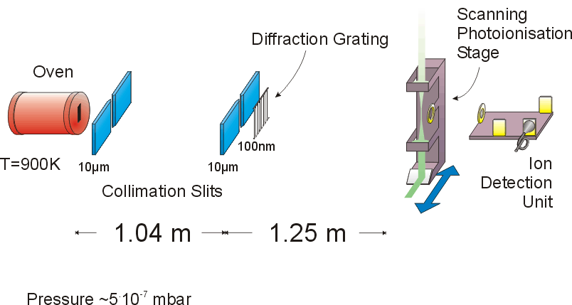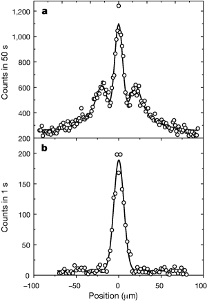 上节课我给大家看了一个电子的衍射图纹,在这里我再给大家分享另外一个故事。这应该是10年左右人们做的一个实验,把一个非常大的分子,即碳60分子(60个碳原子组成的像足球一样的笼状结构)从一个狭缝里打出来,在远处用一个接收器接收,看通过狭缝之后分子会落在什么地方。人们发现,如果它前面什么都不放,它会显示出来是下图下边这个样子,就是说基本上都处于0的那个位置,正好对着这两个缝。过去的这一点就说明它是粒子性的。