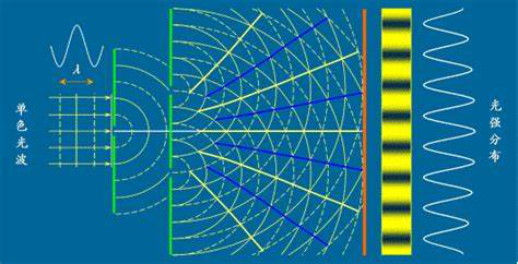 比如现在我给大家看的杨氏双缝实验。一束光通过两个小狭缝变成两个波往前传输。那么在后面的任何一个空间位置,它应该是两个波的叠加。如果要是有一个波传到你这个位置,你站着不动,无论是机械波还是电波,你都会感觉到这个波在上下振动。而当另一波来之后,它也可能在你这位置上下地振动。如果这两个波正好是对应的一上一下,你这个位置就感觉不到任何情况。但如果这同样的两个波一块上下地振动,你就会有强烈的感觉。那么这张图里那些黄色的地方就是这些振动非常强的地方,蓝色的地方就是振动非常弱的地方。最后的结果会怎么样呢?我在双缝后面放一张屏。可以看到这张屏是花的,有的地方光特别强,因为两束光在这个地方产生了协同效应,而在另一个方向两束光互相掣肘。人们说这就是光的波动性。