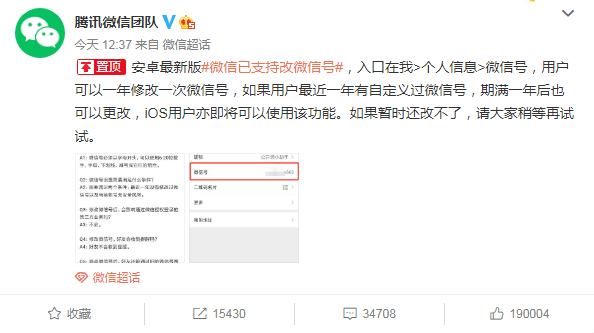 今天中午,@腾讯微信团队官方微博发布消息,安卓最新版微信已支持改微信号,用户可以一年修改一次。如果用户最近一年有自定义过微信号,期满一年后也可以更改,iOS用户亦即将可以使用该功能。
