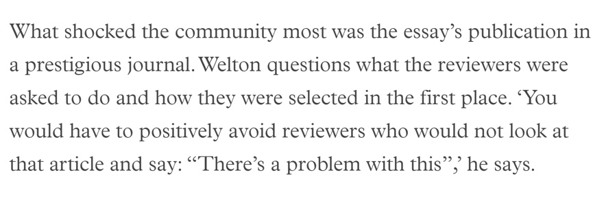 可就是这么一篇展现出赤裸裸的性别歧视、种族主义和精英主义,被学术界大量的批评者认为是“恶毒”和“可憎”的论文,却通过了《德国应用化学》这个世界知名的顶级学术期刊的“同行评审”,并被刊登了出来。这一下子就令此事的恶劣程度,翻了好几倍。