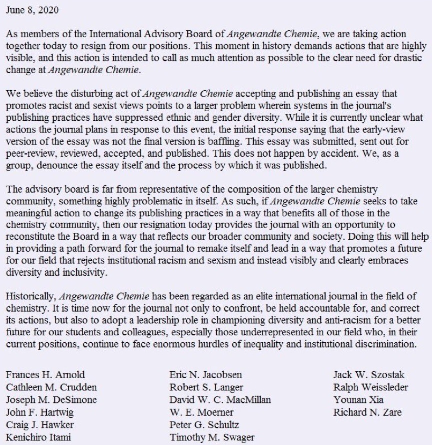 目前,根据“化学世界”网站的报道,《德国应用化学》的44名编委中已经有16人宣布了辞职,并在一份于周二发表的声明中表示他们无法在给这么一个传播种族主义和性别歧视主义,打压种族和性别多元化的学术期刊站台。辞职的编委中包括三名诺贝尔奖获得者。
