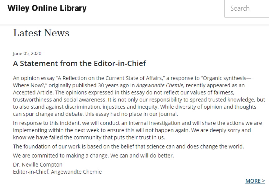 同时,一篇“化学世界”网站刊登的评论文章还显示,在美国因为黑人乔治·弗洛伊德之死而引发的反种族主义抗争运动,也令哈德利基和《德国应用化学》惹出的恶劣事件得到了更为广泛的关注。