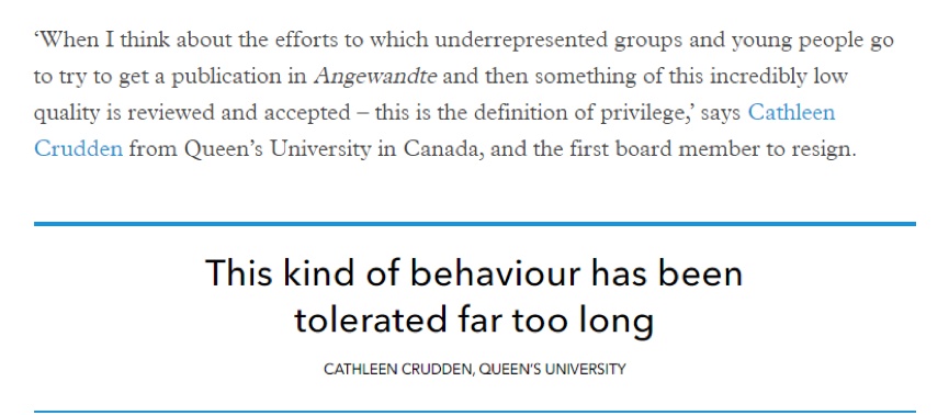 “当我想到那些弱势族裔的人以及年轻人,在努力让自己的论文被《德国应用化学》刊登时,却突然看到这么一篇水平极低的文章通过了评审并被刊登出来,这就叫‘特权’”,该刊最先辞职的编委凯瑟琳·克鲁登(Cathleen Crudden)这样讽刺道。