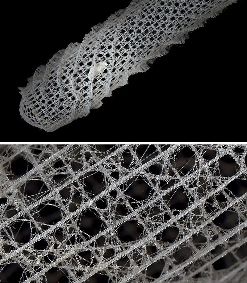 平板扫描仪之趣。这件价格不贵的工具能够创造出非常出色的科学图片,比如海绵阿氏偕老同穴(Euplectella aspergillum)的这些干态图片。上面的一张分辨率非常高,因此可以得到下面那张令人惊叹的特写。放大后,我们能够清楚地看到约50微米宽的石英纤维;背景是一块黑色的天鹅绒。