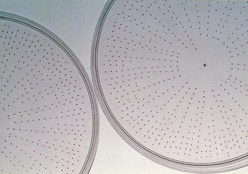 构图。这是两个大肠杆菌(Escherichia coli)培养皿放在灯箱上用相机拍出来的。放射状的大肠杆菌非常抢眼,但是让这张图片脱颖而出的是精心构图(每个培养皿中的图样),而且只显示了每个培养皿的一部分。因此,要认真思考构图。如果有两三个物体,为什么只拍一个呢?为什么只拍一个端在中央的物体呢?把你的工作当成一幅精美的艺术品记录下来,而不是一张专利申请中的插图。