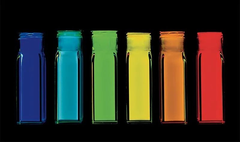 荧光。拍摄荧光材料需要紫外光和长曝光,这意味着要长时间开启快门,这通常少不了三脚架。以这张硒化镉纳米晶体(量子点)的图片为例,曝光时间约为4秒,用了两盏紫外灯。你也可以将紫外光和室内环境光线结合起来。