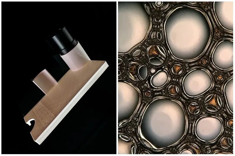 手机相机。我们中的大部分人都切身体会到了手机摄像头的快速升级:现在已经能够拍摄出够得上发表水平的照片了。就分辨率而言,手机相机仍比不上平板扫描仪和单反相机,但是用于拍摄早期概念性工作足够了,比如拍摄各种草图,为之后的相机拍摄做准备。手机相机也可以和显微镜结合使用,不过需要辅助工具(如左图所示)把手机固定在目镜上。右图便是通过这种方式拍摄出来的照片,拍的是稀释咖啡中的水泡。