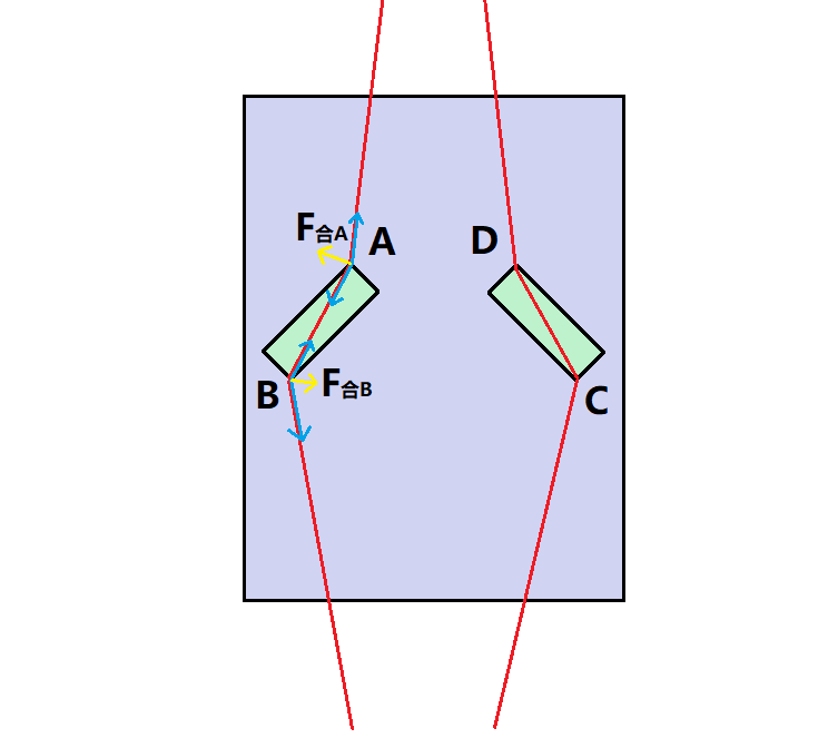 首先我们分析下装置的受力情况,如上图所示,由于两根小吸管呈“八”字结构,所以,当我们拉紧两端的绳子时,绳子会呈一定的夹角,这个夹角有两个作用。一方面,绳子上张力的合力会对吸管产生一个压力,进而产生阻止纸牌下滑的摩擦力。另一方面,A、B两处的合力矩会使纸牌逆时针转动,而C、D两处的合力矩则会使纸牌顺时针转动。