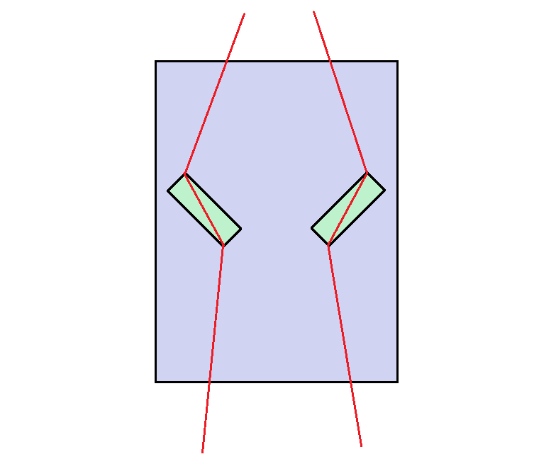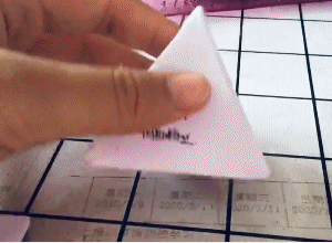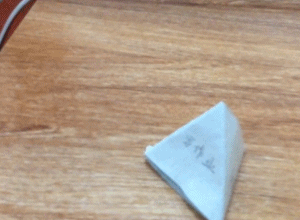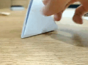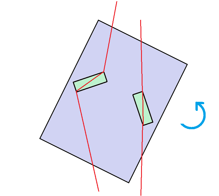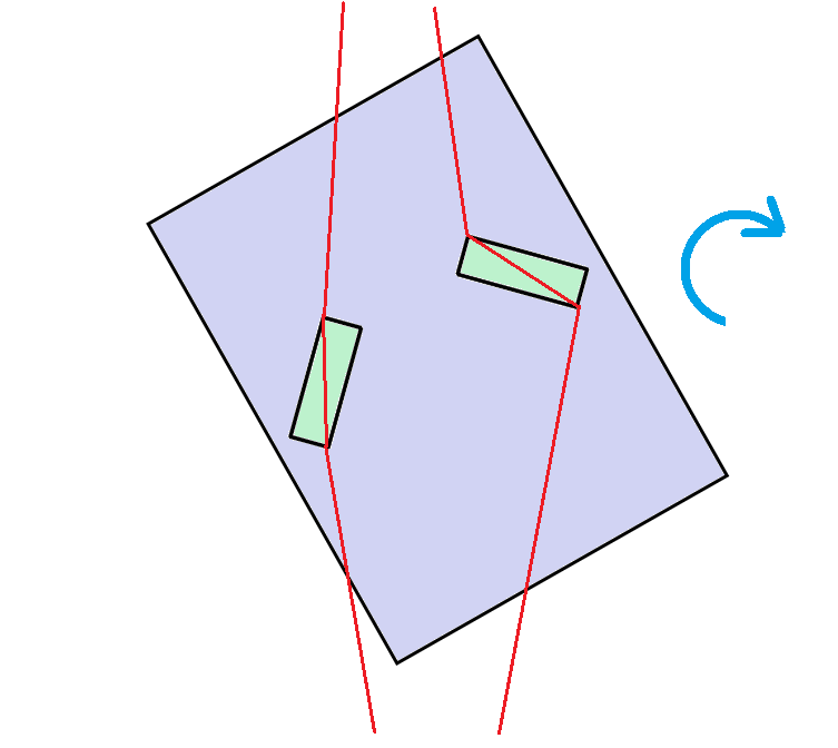 当我们用力拉右侧的绳子时,受右侧绳子的张力影响,纸牌会发生转动,形成如上图所示的情形。可以看出,这时右侧绳子的夹角变大了,张力的合力减小。而左侧绳子的夹角变小了,张力的合力减小。