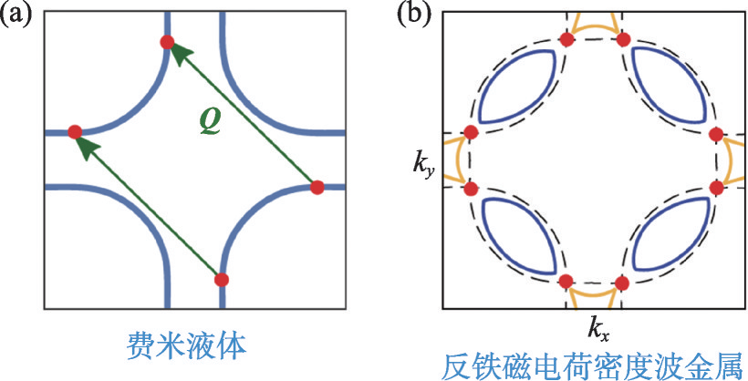图1 Luttinger 定理和费米面的面积 (a)二维正方晶格无相互作用费米子具有一个大费米面。当其感受到反铁磁相互作用时(如在 Hubbard 模型中),反铁磁的波矢可以将费米面折叠成(b)中的小费米面,或者叫口袋(pocket)。不论是大费米面还是小费米面,其面积和布里渊区的比例就是系统中的电子占据数,即Luttinger定理。在从(a)到(b)的过程中,电子占据数没有发生改变[7]