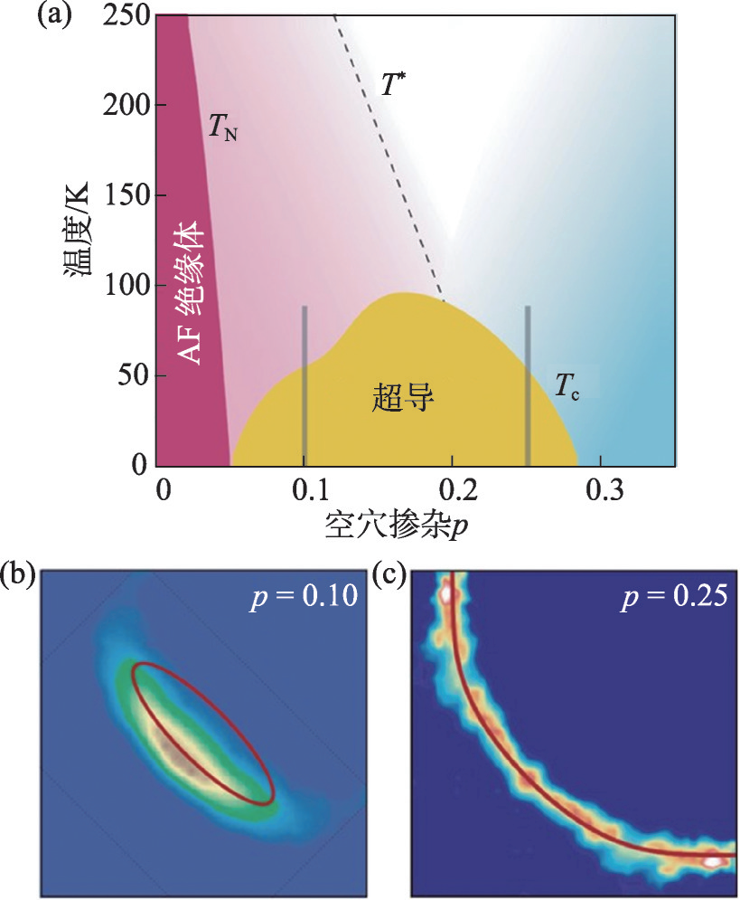 图2 (a)铜基超导空穴型掺杂的示意相图;(b)角分辨光电子能谱观察到欠掺杂区的费米弧(Fermi arc),是没有闭合的费米面,不满足Luttinger定理,红色圆圈为量子振荡实验观察到的费米口袋(Fermi pocket);(c)角分辨光电子能谱观察到过掺杂区完整的费米面,其面积和电子占据数吻合,满足Luttinger定理[13]