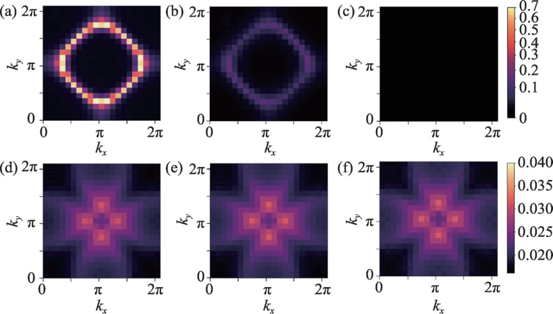 图4 从费米液体金属到正交金属的相变过程。图(a)、(b)和(c)为复合费米子的费米面的变化:图(a)处于费米液体金属,有费米面;图(b)为临界区域,费米面正在消失;图(c)处于正交金属相,没有费米面。图(d)、(e)和(f)为相变过程中的自旋磁化率。不论是在费米液体金属还是正交金属相,近似钻石型的费米面导致自旋磁化率图的中心出现4个小峰,说明费米液体金属与正交金属具有相同的磁学响应