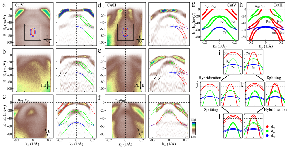 图2. 单畴 FeSe 沿高对称方向的能带劈裂及其轨道属性