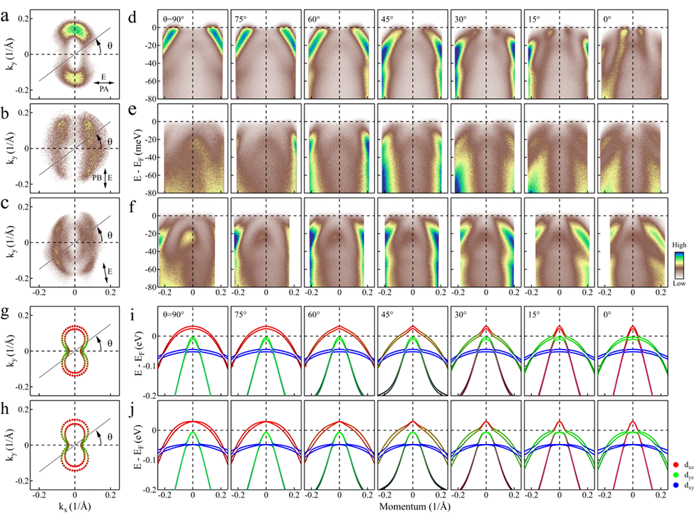 图3. 考虑空间反演或时间反演对称性破缺计算的 FeSe 费米面和能带结构及其与实验测量结果的对比