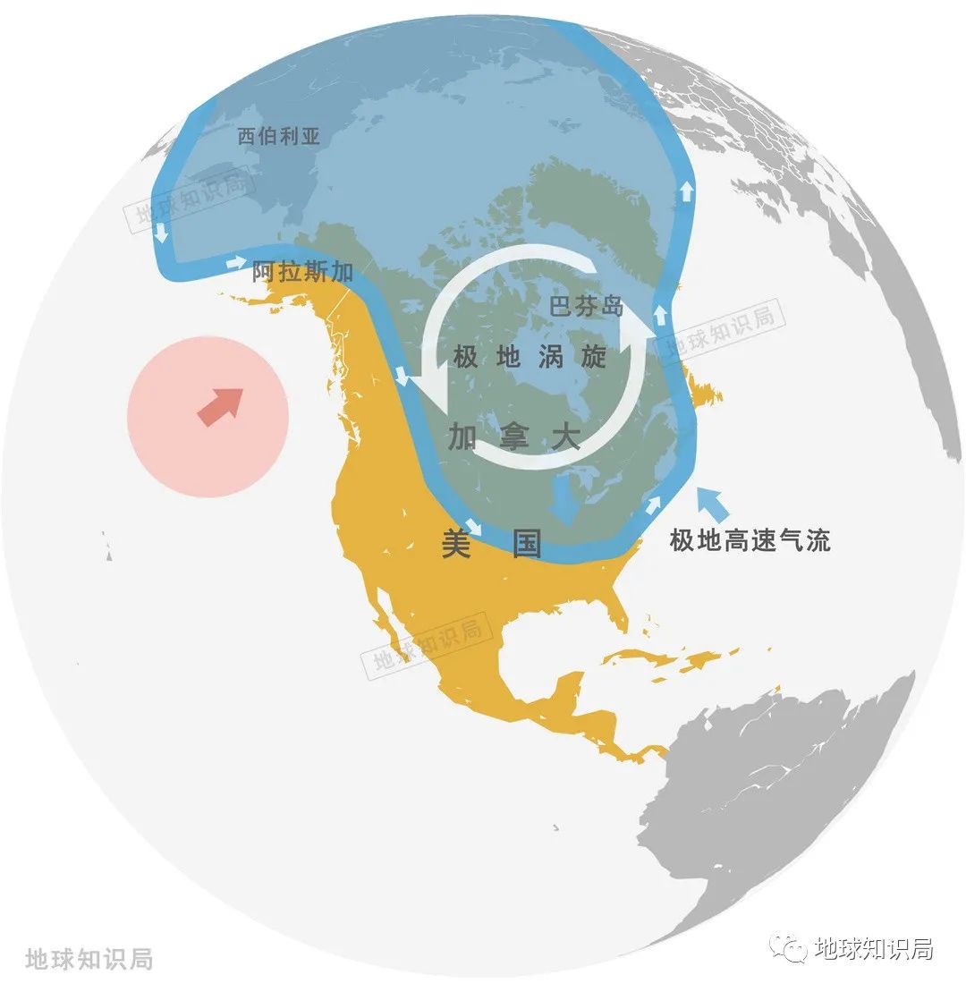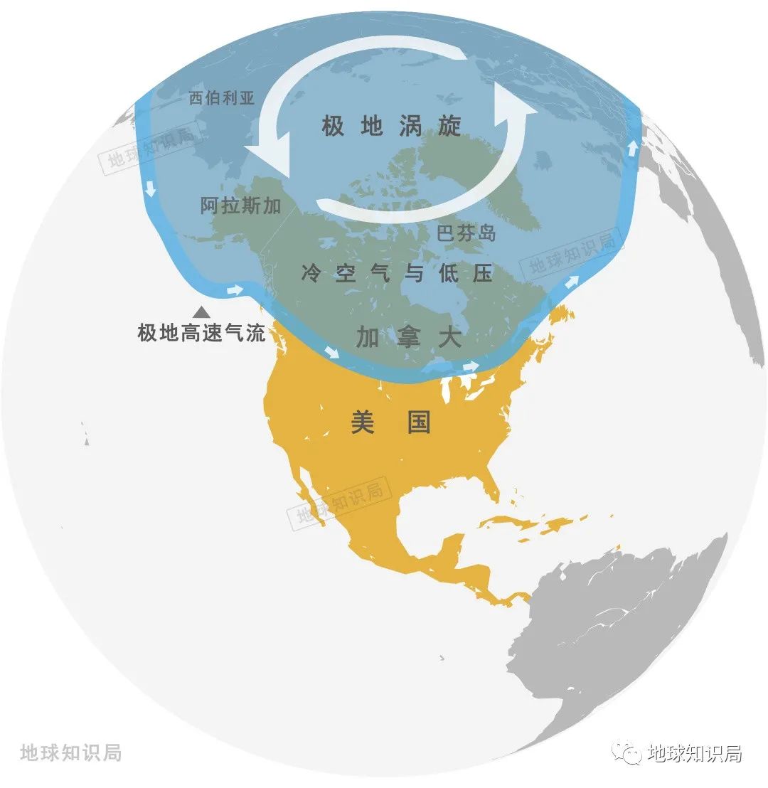 此外,极地涡旋是影响气候的重要因素,它是大气高层的紧密旋转气流。漩涡可以将极地温度极低且密度较大的空气,一直通向上空的平流层,就像无形的弹力绳“束缚”着冷空气,把冷空气限制在北极地区。