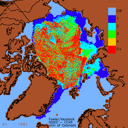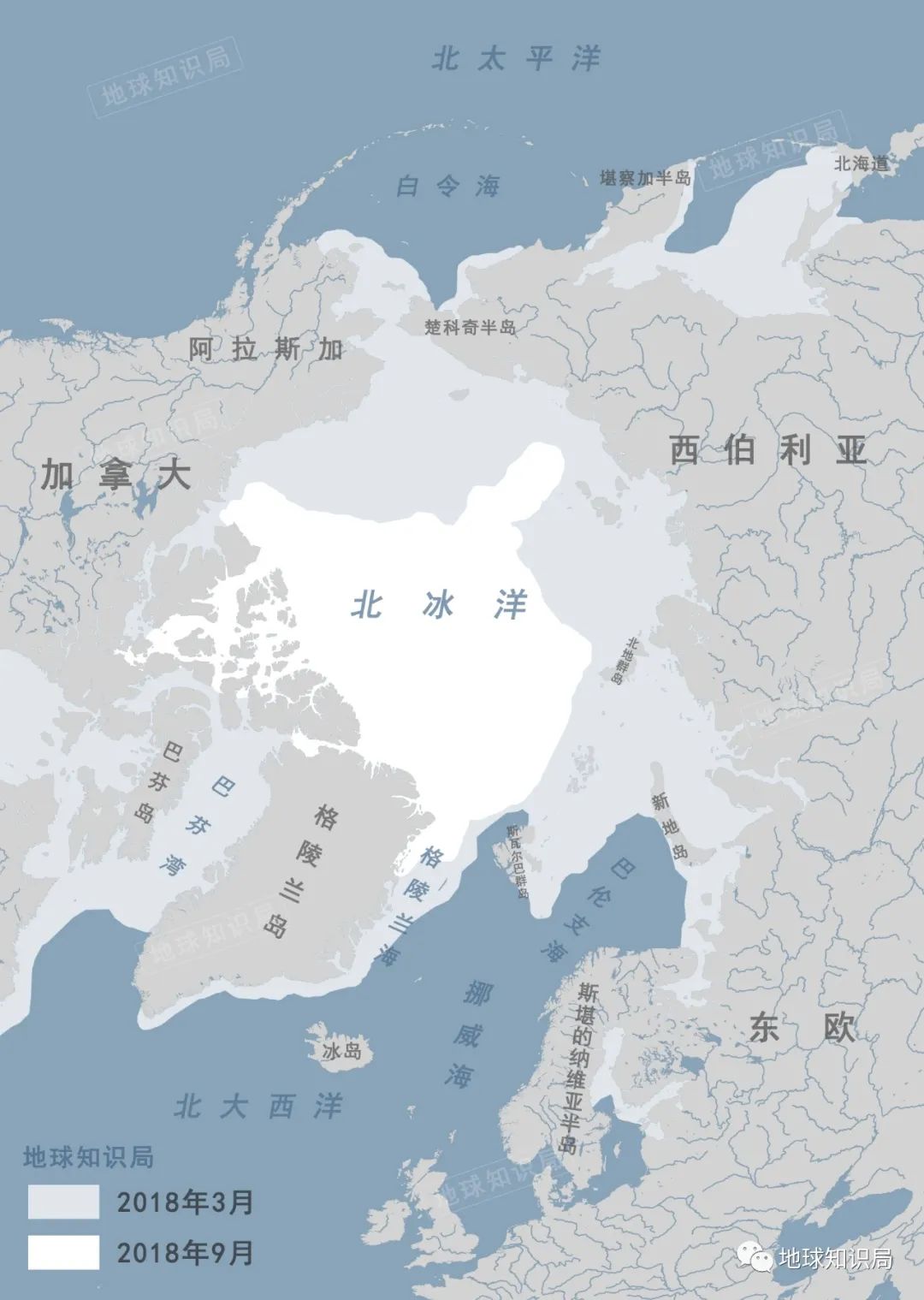 在正常年份,北极的海冰面积在3月份时到达最大值16000000平方千米,9月份时经过一整个夏季的融化,到达最小值7000000平方千米。因为海冰的反照率远远大于海水,所以冬季时可以反射而不是吸收更多的太阳能,夏季则相反。数百万平方千米的冰盖与海水之间的切换,对全球气候都能起到影响,对北半球中高纬度的影响尤其明显。